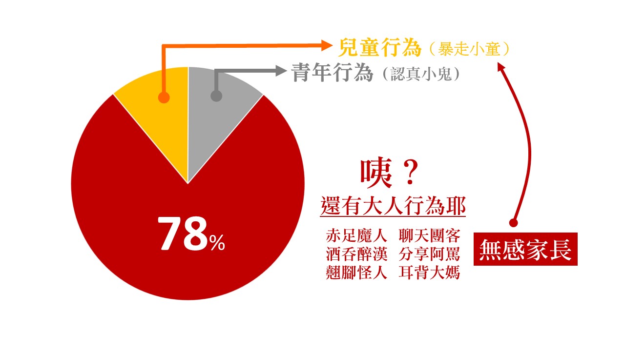 我所強調的是:不太會有人苛責身為新手父母不會教孩子,這些都是可以學習的。或許乘客在意的是在公共場所應有作為而未作為,因為「暴走小童」多數還可以忍耐,但「暴走小童」加上「無感家長」才是讓人比較困擾。