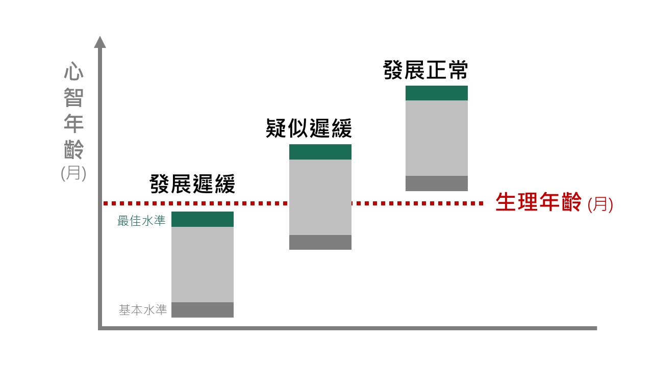 我們可以把每個領域都看做有對應的行為表現,孩子發展的範圍就是把相對應的年紀應該出現的能力,評估是否已發展出來;當孩子在一系列的目標行為中已經發展出對應能力,那麼就表示已經達成該年紀的基礎發展任務,要往下一個階段發展,這些發展出來的心理功能,也可以視為孩子的「心智年齡」;每個孩子在這些面向中有所謂的「基本水準」和「最佳水準」,而基本表現和最佳表現之間的差距就是孩子的發展範圍,我們也可以把它當作「心智年齡的發展區間」;基本上心智年齡發展的範圍要跨越孩子的生理年齡,如果基本表現低於生理年齡,那麼就得進一步評估是否有發展遲緩。