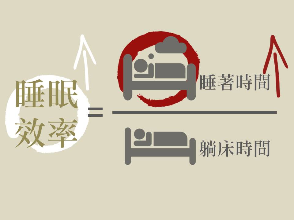 失眠改善的其中一個指標是提升睡眠效率,也就是以前睡得很不好,睡眠效率可能只有百分之五十,在經過治療後睡眠效率可以提升到百分之八十或九十。那我們可以怎麼做呢?要提升效率的方式,其中之一就是增加「分子」,也就是:讓你躺在床上睡著的時間增多,所以安眠藥物的作用就是讓你很快入睡,然後在床上進入夢鄉。