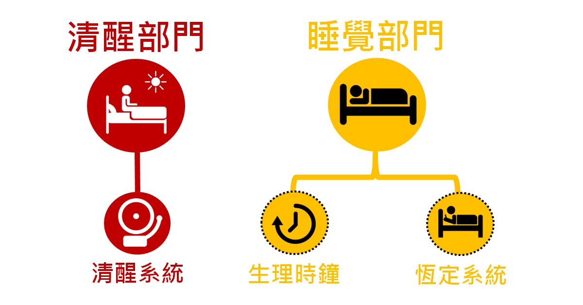 清醒部門只有「清醒激發系統」;睡覺部門有「恆定系統」和「生理時鐘」兩大系統。
