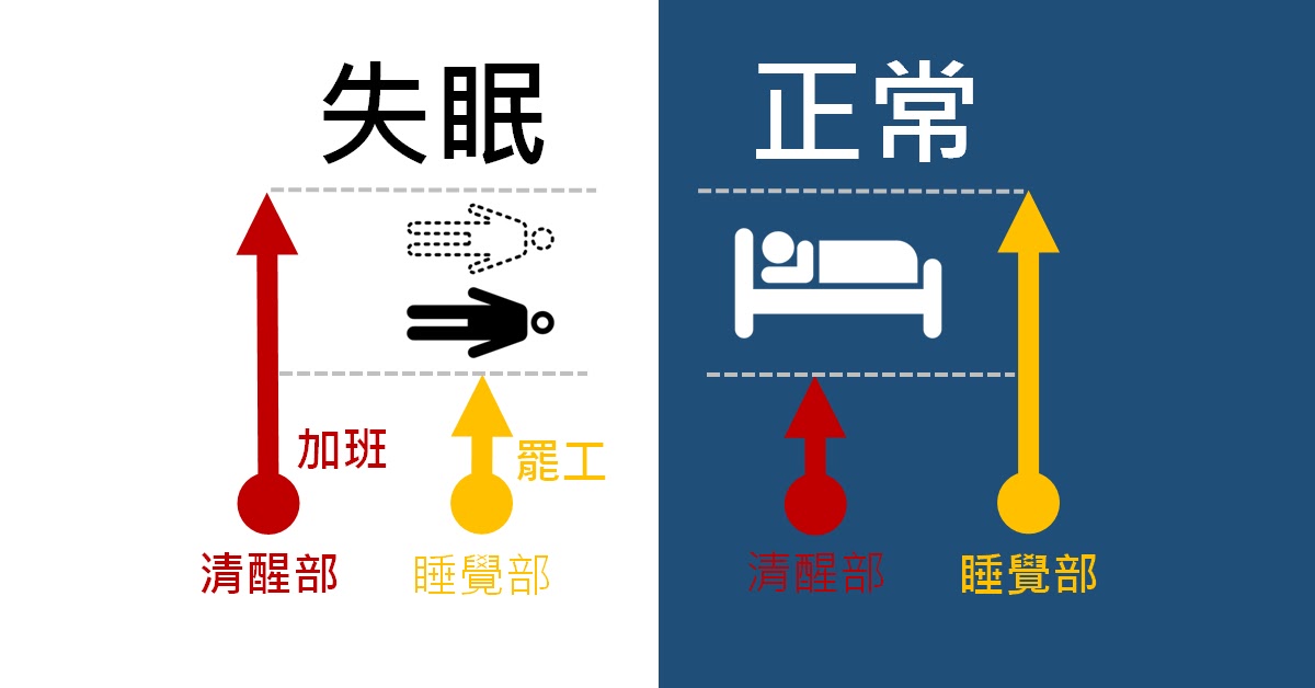 但對於失眠患者而言,身體內的「睡眠部門」與「清醒部門」開始溝通不良,到了晚上,「睡眠部門」罷工,但「清醒部門」卻瘋狂地加班,因此身體到了該睡覺的時候仍然精神百倍。