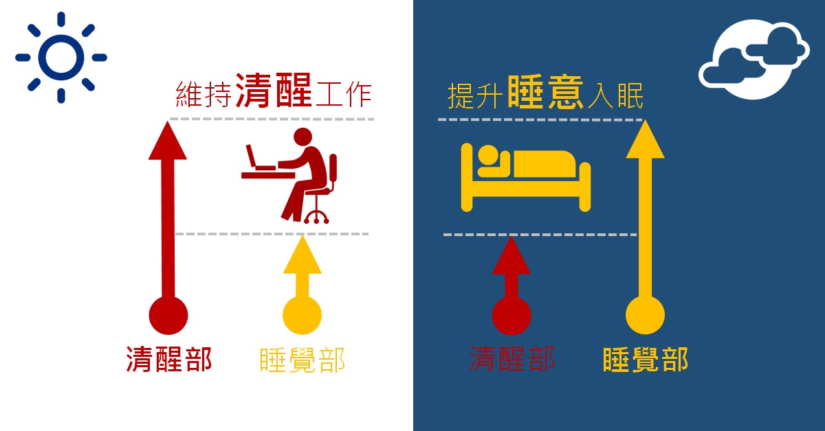 假設我們身體裡有兩個部門分別控制著你的「睡覺」和「清醒」。在旭日東昇時,清醒部門的作用需要比睡覺部門活躍,所以我們才可以在日間保持清醒狀態來工作(萬一你在白天時,清醒部門發揮不了什麼作用,那叫做「嗜睡」或「精神不濟」)。但到了夜幕低垂,清醒部門的運作要慢慢減弱,這時候睡覺部門要變得比較活躍,這時候你才會感受到睡意(萬一你在晚上時,睡覺部門發揮不了作用,那叫做「失眠」)。這樣好理解吧?
