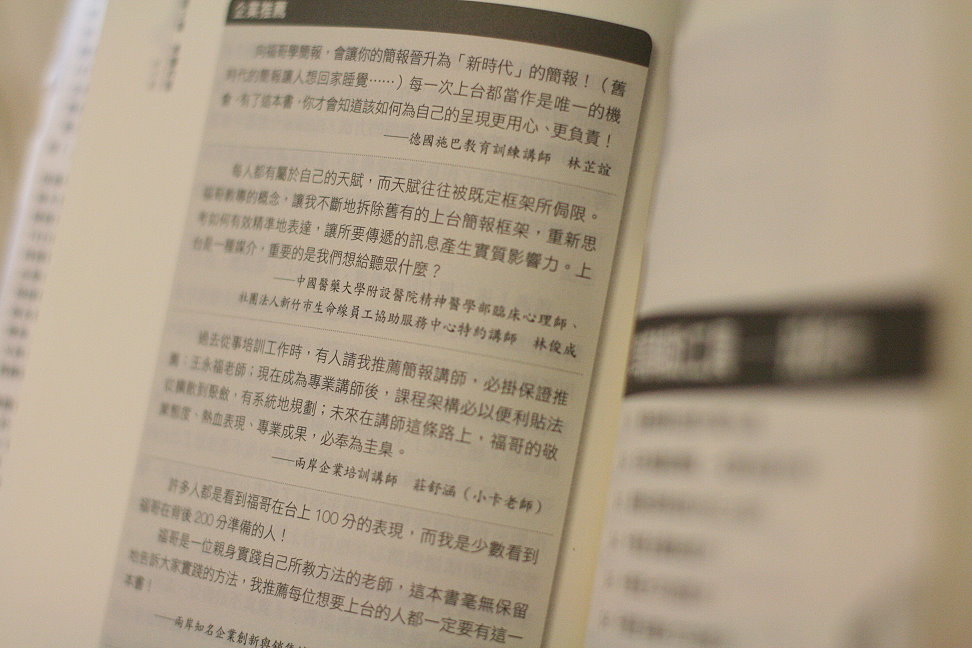那時候我覺得這是個重要的能力,但不知道哪兒可以上這種課?於是我按圖索驥,從福哥推薦的書籍開始研究。《千萬講師的百萬簡報課》和《簡報禪》是我的入門書,然後再到《TED talk十八分鐘的秘密》,接著開始練習如何製作投影片,遇到瓶頸時還鼓起勇氣寫信給福哥,詢問簡報相關的問題(我還記得第一次透過電子郵件問福哥的問題,還有榮幸被收錄在福哥新書《上台的技術》中,在P170頁唷!想知道那時候稚嫩的我問了什麼嗎?請自行買書來看)。