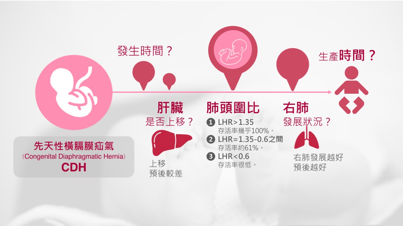 如果胎兒發現橫膈疝氣,那麼要考量第一個問題是:孩子能不能活?過去研究發現有幾個指標是關鍵:肝臟有沒有跑到胸腔(liver-up右側肺部發展是否良好(Right CDH肺與頭圍的比值如何(LHR)?這是胎兒出現橫膈疝氣評估預後的幾項指標,肝臟跑到胸腔以及右側肺部發展不完全,死亡率(mortality)會比較高,出生後甚至需要使用葉克膜代替的心肺功能,減輕嬰兒的心肺負擔,但是嬰兒使用葉克膜的併發症也相對較高。