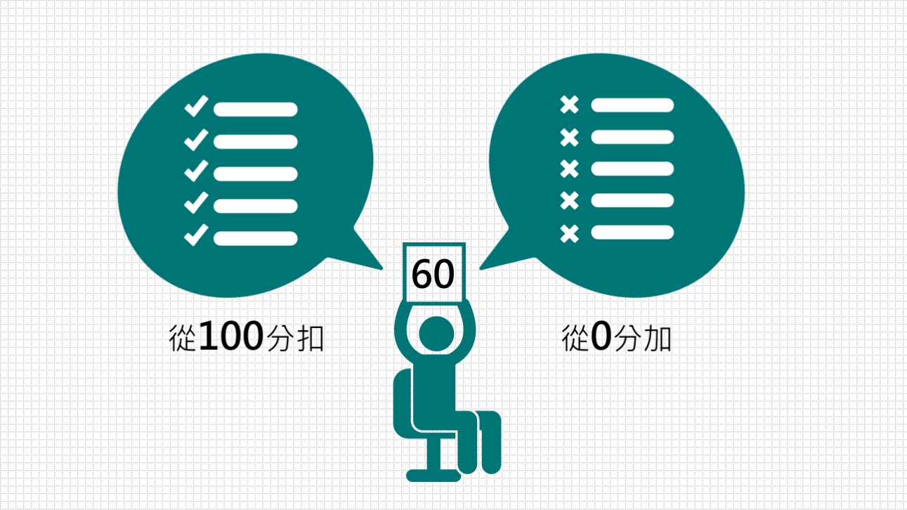 | 明明最後結果是一樣的,但是我們卻會因為起點不同,而有不一樣的評價。甚至會苛責從100到60分的表面現象,卻鮮少關心「孩子怎麼了?」 |