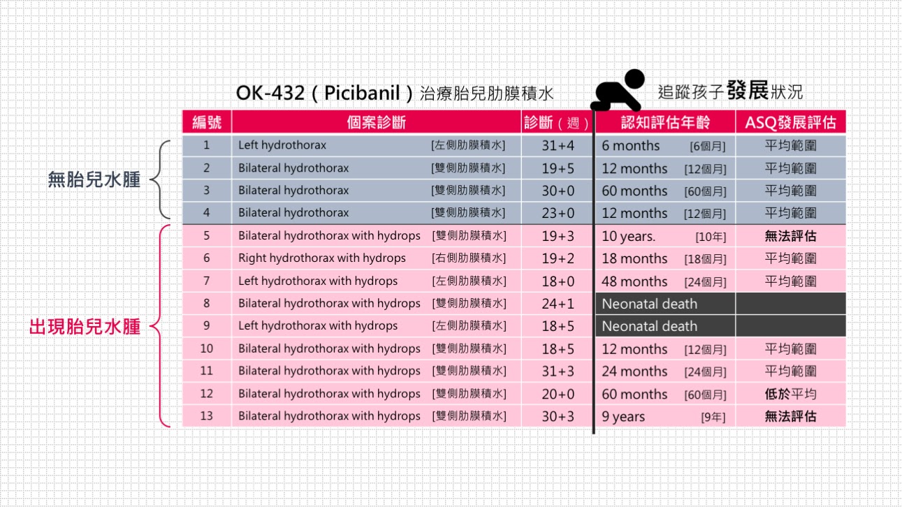香港中文大學的教學醫院「威爾斯親王醫院(Prince of Wales Hospital)」乳糜胸也曾有首宗個案報告,使用OK-432成功治療20週雙側胸腔積液的胎兒(Leung et al., 2012)。在這篇報告裡,也比較了「肋膜羊膜腔導管」和「肋膜粘黏術」兩種治療方法的差異。
