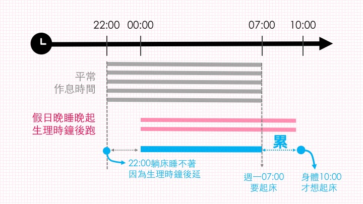 | 假日夜生活過太晚,白天補眠補太久,然後生理時鐘就不小心往後跑囉!接著週一又得回到平常時間入睡,這時候通常會睡不太著,然後早上又要恢復早起,但生理時鐘已經往後跑,這時候就會容易累,也就是所謂的Monday Blue。 |