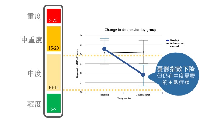 Woebot研究裡憂鬱指標明顯下降,從使用前憂鬱量表平均分數14.30(中度憂鬱症狀),到使用後量表平均分數下降為11.14(中度憂鬱症狀)。表面上看起來分數是有改善,但臨床實務上他仍落在中度憂鬱症狀的範圍。