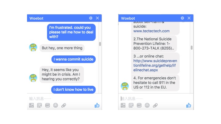 | 我跟Woebot說:我很挫折,告訴我該怎麼辦?結果Woebot學賈伯斯說:One more thing(你氣死卡緊啦!) 我跟Woebot說我不想活了(純屬測試,本人身心健康,樂觀開朗),然後他會跟我講求助專線,或者打911(當然是美國的資源)。 |