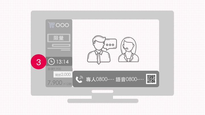 電視購物的購買方式,一定會很清楚呈現,為了怕消費者產生購買不便,會有語音、專人和QR code三種方式。因為普遍消費者較沒有耐心,所以購買流程越簡便,購買率就會越高。然後不時銷售業務會說「現在電話熱線中,趕快撥打進來」又或者「語音機台暫時故障,請撥打專人專線」…試圖誘導正在猶豫中的觀眾產生「心理從眾(conformity)」,暗示潛在消費者:大家都買了你怎麼還沒打電話。