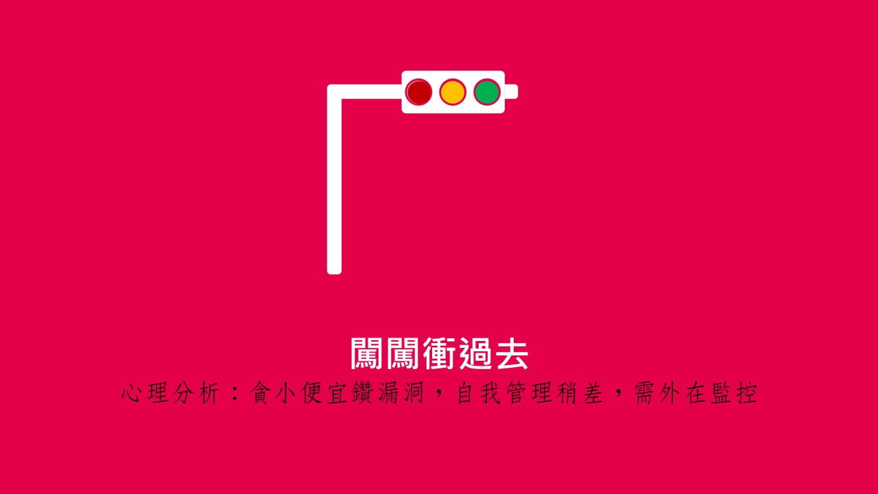 「紅燈停,綠燈行,黃燈要小心」有些人自動變成了「紅燈停,綠燈行,偶爾闖闖沒關係,黃燈趕快衝過去」。這種人往往都認為:沒有被抓到都不算違規。所以在職場上,通常比較會鑽漏洞或者貪小便宜,如果是那種阿桑闖紅都、紅燈右轉的,跟去菜市場通常都是殺價殺最兇的。